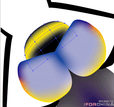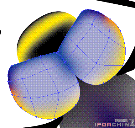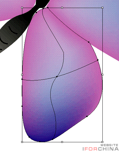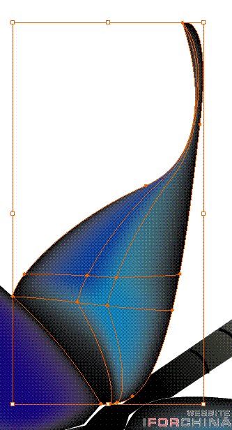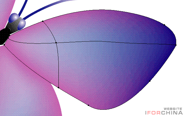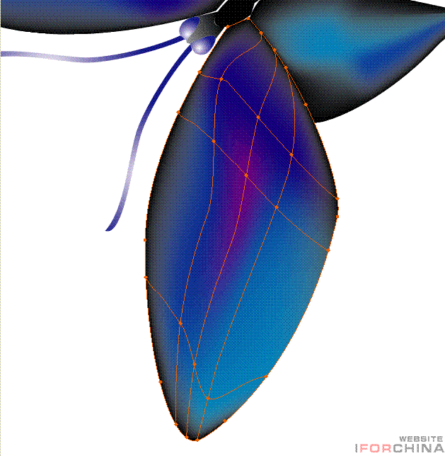 五.留意进行网络渐变的部分是边一定是无色的。选择网格渐变工具,点击一个翅膀,增加格数并将他们拉出一下的弧度,如图在每个结点上用不同颜色上色。