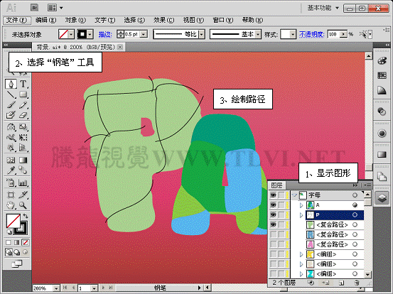 (7)同样的绘制字母"P"图形,使用"钢笔"工具绘制路径。
