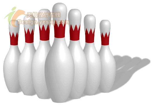 至此,3D保龄球瓶制作完毕。如果使用不同的贴图,并为最终的7个保龄球瓶添加阴影,可以得到与图25所示不同的结果,例如如图26所示的示例。可以举一反三,自己多尝试制作各种类型的保龄球瓶效果。