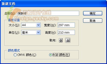 1.启动AI CS2中文版,选择菜单命令"文件>新建"(或按快捷键Ctrl+N),在"新建文档"对话框中输入名称"保龄球瓶",设置画板取向为"横向",颜色模式为"RGB颜色",如图1所示,然后单击"确定"按钮。