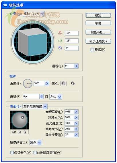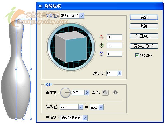 5.单击"确定"按钮,返回到"3D 绕转选项"对话框。单击"更多选项"按钮,在对话框下方设置"表面"属性,在"表面"右侧下拉列表中选择"塑料效果底纹",然后将"光源强度"设置为90%,"环境光"设置为50%,"高光强度"设置为10%,"高光大小"设置为30%,其它采用默认设置,如图18所示。如果要想得到更逼真的保龄球瓶效果,需要花些时间对这些选项再作进一步的细微调整,这个工作留给聪明的读者吧,由于时间仓促,先用这个效果进行下一步的讲解。