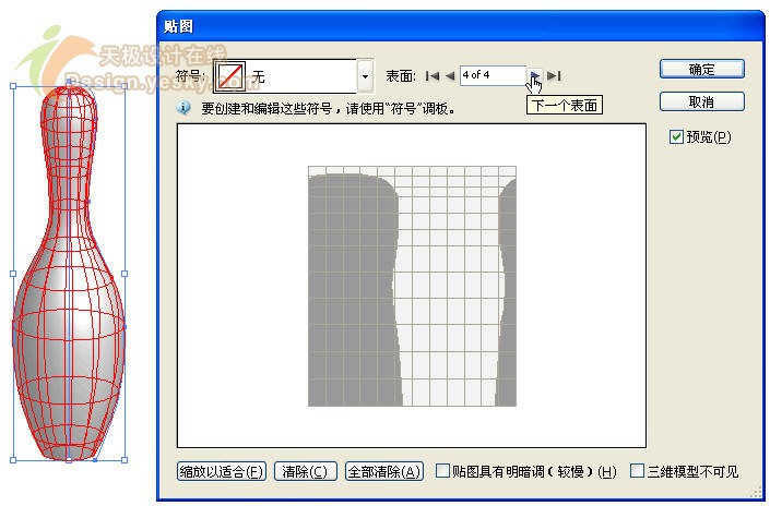 3.单击"3D 绕转选项"对话框中的"贴图"按钮,打开"贴图"对话框,选中"预览"复选框,然后单击"表面"右侧的"下一个表面"按钮,直到看到如图16所示的第4个表面,在保龄球瓶上也可以看到这个表面是保龄球瓶主体环绕一周的表面。