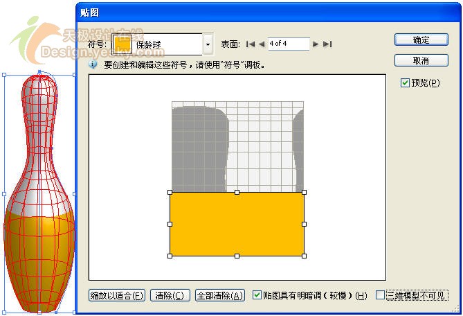 4.单击"贴图"对话框左上角"符号"右侧下拉列表,找到前面创建的符号"保龄球瓶",然后在下方调整矩形的大小,并选中复选框"贴图具有明暗调(较慢)",如图17所示。选中复选框"贴图具有明暗调(较慢)"才能使贴图区域也具有高光和暗调,这样才能得到逼真的效果,否则这个区域将会是一片纯色。