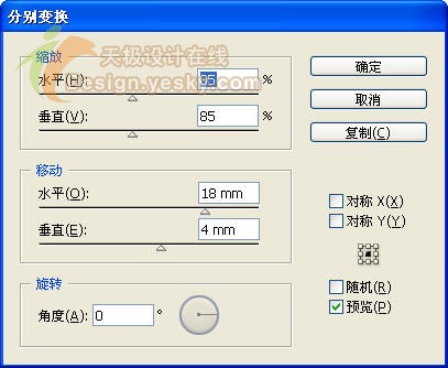 11.使用"选择工具"选中最大的保龄球瓶,然后选择菜单命令"对象>变换>分别变换",在"分别变换"对话框中将"移动"区域的"水平"距离设置为-18mm,其它选项采用与上次变换相同的设置,然后单击"复制"按钮,在其左边复制出一个保龄球瓶。
