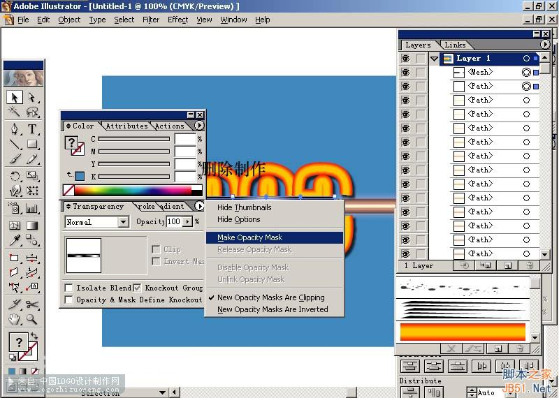 26.将填上黑白网格的矩形与前面白色的矩形全选,打开Transparency面版,点开右边的小三角,选择里面的Make Opacity Mask(透明)