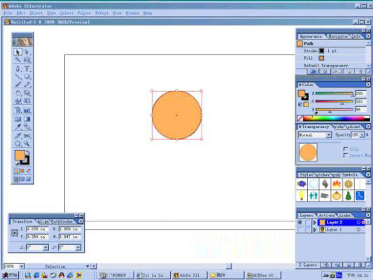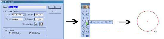 现在,在Illusrtator中新建一个640*480的图像文件,使用RGB颜色,然后选择左侧工具箱中的圆形工具,动手画一个圆吧,这就是他的脑袋了。(图3)用黑箭头工具将这个圆形移动到你喜欢的地方,进行缩放,把它变成你想要的大小,鼠标再移动到右侧的Color面板,选取一个你喜欢的颜色,作为他的肤色。在这里我使用的值是:R255,G181,B95。(图4)