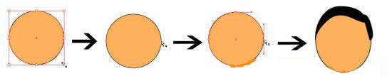 让我们想想,他的脸不应是一个标准的圆形。好,我们要让他的下巴变尖些,在圆形外空白的地方任意点一下,取消对圆形的选取。选择工具箱中的白箭头工具,移动到圆形上。回想一下,刚才我们在画圆形的时候,可以看到这个圆形有上下左右四个端点,这就是组成这个圆形的路径基本操作点。改变这任意一点的位置,就可以让图形形状发生变化。当白箭头工具移动到任意一个基本操作点时,你会看到它的下方出现一个空白的小点,表示这一点已处于你的控制之下。单击鼠标左键,图形出现了指示线,表示已处于修改状态,鼠标称动到任意一点后按住左键不放,就可以对图形形状进行任意的变化了。还犹豫什么,快把他的下巴往下拉吧。在画脑袋的过程中,希望你能尽快记住黑箭头与白箭头的操作。在下面的文字中,我们将不会对此再重复了。