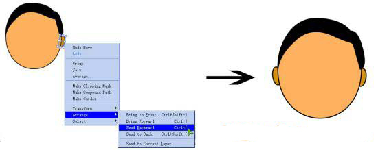 加个耳朵给他吧。很简单,画一个长椭圆形,选好填充色,用黑箭头工具进行缩放旋转,移动到右侧。由于这个部分是后画的,所以它会位于所有图形的最上方,盖住脸部。该调整一下。点击右键,在弹出的菜单中选择"Arrange→Send to Backward",把它移到脑后。然后,对耳朵进行复制粘贴,再调整好放在他的左边。两个耳朵就都出来了。(图9)