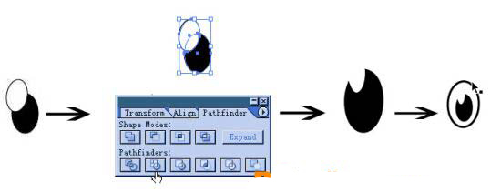 眼珠子,是画中传神的地方,是不是很难画呢?哈,画出两个椭圆,一个用黑色填充,另一个用白色填充,如图放在一起。现在,调出PathFinder(路径寻找器)面板,快捷键是Shift+F9。用黑箭头工具把这两个椭圆都选定,按下Subtract(减除)按钮,眼珠子就做好了(需要注意的是,按下Subtract后,两个椭圆的原路径实际还保留住,如果你按下旁边的"Expand"按钮,那么这两个椭圆的路径才会合而为一。是否需要"Expand",那就看个人需要。)。然后,在眼珠子外再加一个椭圆,放在眼珠子的下方,用黑箭头调整两者的大小,这就是眼睛了。(图10)