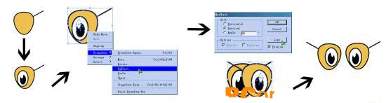 这个小男孩是戴着一幅眼镜的,所以我们还需要一副眼镜。首先,是镜片,有了前面几步操作,你也许立刻想到——又是一个椭圆!对,镜片实际上是一个用白箭头工具调整过的椭圆,放在眼睛的下方。然后再用工具箱上的"Line Segment tool"(直线工具)画出一条直线,(图11)调整倾斜度后放在镜片旁,做出半边镜框。好,他已经有了一半的眼睛了,我们要一鼓作气,把他的整个眼部画出来。用黑箭头工具选择这半边眼,点击鼠标右键,在弹出的菜单中选择"Transform(变形)→Reflect(反射)",在Reflect子菜单中选择"Vertical"(水平),再点击右下方的"Copy"按钮,我们成功地把他的另一半眼睛做出来了,小心地把这一部分放到合适的位置。