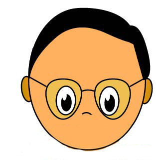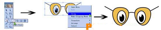 (图12)眼镜中间的架接部分实际上是一条弧线,是用"Arc tool"做出来的。"Arc tool"就隐藏在前面用过的直线工具的后面,用鼠标左键点击直线工具,按住左键不放,几秒钟后自然弹出隐藏菜单供你选取。画出弧线后经过黑箭头工具的加工放在两眼中间。眼部的绘制算是完成了。为了以后加工方便,我们要将这部分合并起来,用黑箭头将整个眼部选取,点鼠标右键,在弹出的菜单中选择"Group"(组合)命令,将它们组为一体,调整大小后放在脑袋上面。(图13)对了,还有鼻子。再画一条弧线放在眼睛下方。整个头部大功告成矣!(图14)