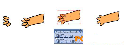 手部的绘制就是典型的椭圆组合,这里一共用到了5个椭圆。有4个是作为手指,1个作为手臂。作为手指的椭圆是很容易画的,你只要把它们如图示放在一起就行了,而作为手臂的椭圆则需要用白箭头工具进行一些细调,然后把它们用"PathFinder"面板中"Merge"(合并)命令的组合在一起。要注意的一点是,做为手臂的椭圆是后画的,所以它会被放置在4个手指之上,你要把它用右键菜单中的"Arrange→Send to Backward"先把它放在手指的后面。这一步的具体操作如图所示,不再多言。(图15)