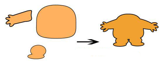 画好了一只手后,让我们回想一下上面绘制眼睛的步骤。由于他的身体是左右对称的,我们可以用同做眼睛一样的方法来做出他的另一半手,同理,也可以把他的双脚都画出来了。也就是说,我们只需要再做3个椭圆就行了,1个是他的身子;另外2个,则组合成他的另一边脚。躯干完成图如图所示。算起来,要画好身体一共要画8个椭圆,既然要画那么多个椭圆,我就不妨再透露一招——在画椭圆时按住Alt键不放,再按住鼠标左键上下左右地移动,就可以很容易地把你想要的形状画出来了。(图16)