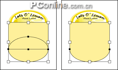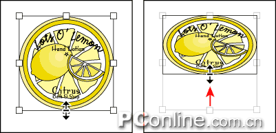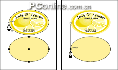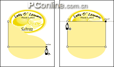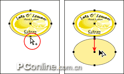 从工具箱中选择直接选取工具,选择柠檬图案中最外边的淡黄色椭圆形。按住alt+shift(windows)或option+shift() ,用鼠标拖动椭圆向下移动,在椭圆原件的下方建立一个副本。调整副本的摆放位置,直到智能辅助线显示副本处于原始图形的正下方。(图02)