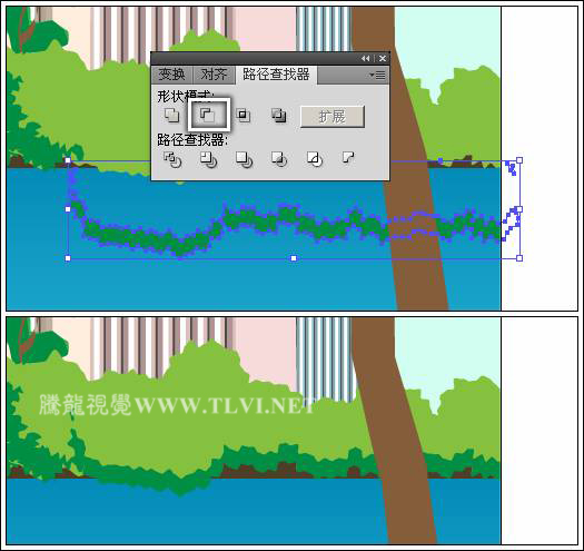 (4)将两个副本图形选择,执行"窗口"→"路径查找器"命令,打开"路径查找器"调板,单击"减去顶层"按钮,使图形上层图形减去下面的图形。调整剩余图形的位置,如图3-195所示。