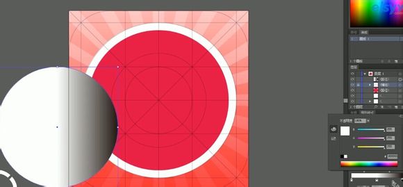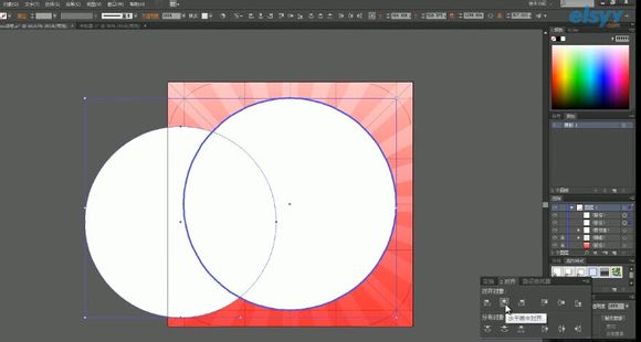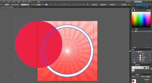 在AI里,需要用到混合模式的同时结合别的效果来给它表现出来可以把这个半透明的圆分为三个部分上半部暖色调,中间的部分是眼睛的图形,和下半部分的冷色调。