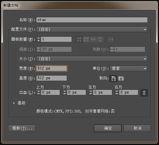1、在AI中新建文档,宽高均为512像素,如下图(不要问我为啥是512px,我也不知道,我试了几次后算出来的,只有这个尺寸和网页里的字号是对的上的);