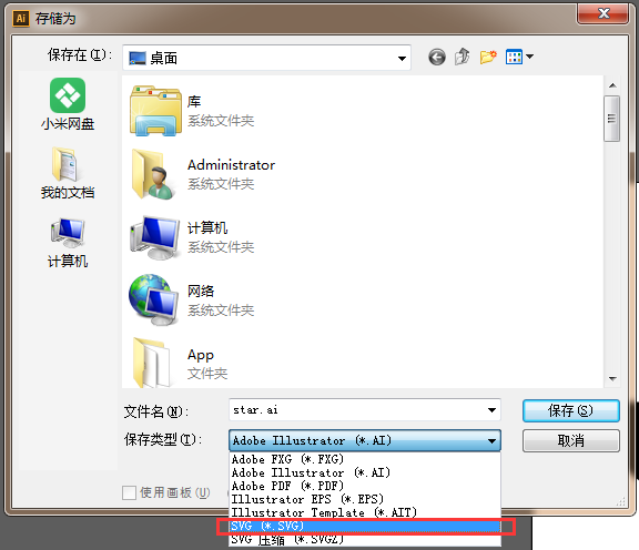 3、画完后保存,保存时要选择SVG格式,这是重点,如下图。SVG选项默认的就好(我的默认的是1.1版本),另外命名和图标要匹配,用英文,懒的话用拼音,至少保证自己认得哪个是哪个。多个单词用"-"代替空格(svg文件可以在浏览器里打开查看哦);
