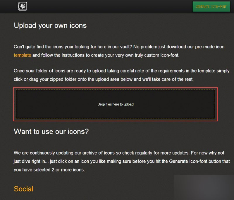 6、访问地址:http://iconvau.lt/app(稍有些慢,还请耐心等待。这个网站很厉害,直接把后两大步包办了),进入后会看到如下界面,将zip文件拖入到红框范围中(也可点击红框范围,选择zip文件),耐心等待文件上传并转换,别关浏览器。字体转换完成后会自动下载一个名为iconvault.zip的文件,没有自动下载可以点网站中出现的链接进行下载(压缩包放在附件里供大家参考)。