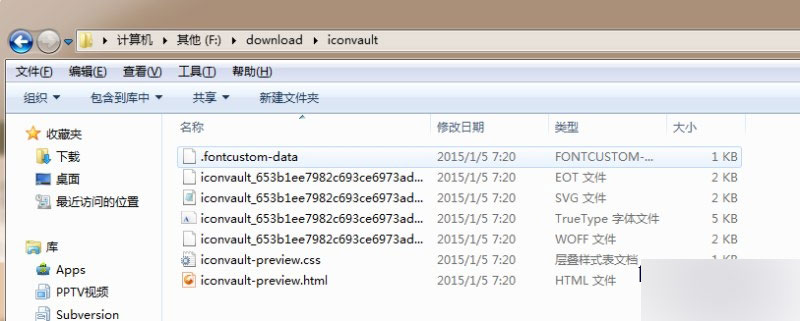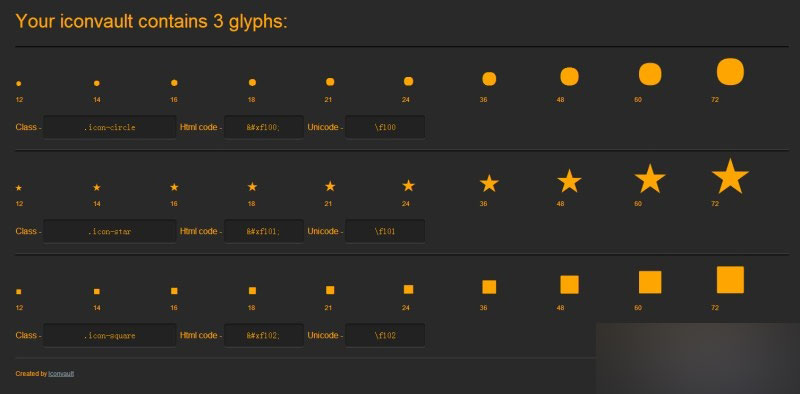 7、解压iconvault.zip文件,能看以下文件(可以开启后缀名查看文件类型):.fontcustom-data可以删除,eot、svg、ttf、woff这四个是字体文件,分别兼容不同的平台。一个CSS文件,以及一个html文件。用浏览器打开html文件,可以看到你设计的全部图标,以不同的字号排列在里面。