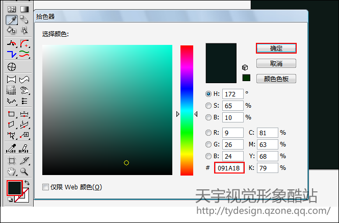 2、双击前景色,设置前景色颜色为:#091A18,设置完毕后点击确定。