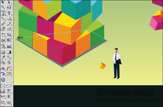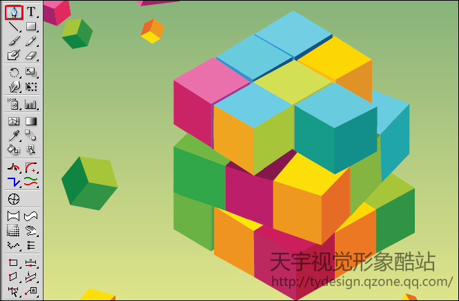 8、在魔方的底部,利用钢笔工具,绘制一个灰色的多边形,使其成为魔方的底部投影,这样使魔方更加稳重。没有阴影感觉轻飘飘的。完成效果如下: