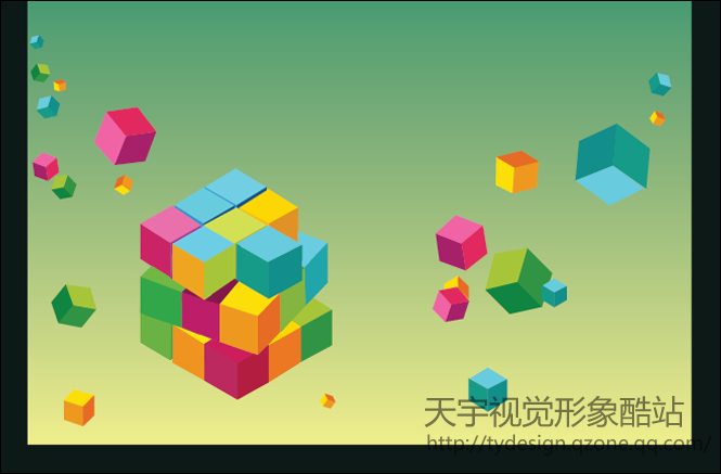 6、中间的一个大魔方做好后,旁边的小正方体可以从原来的魔方上复制粘贴。然后进行旋转改变大小。使其变得有层次感。完成效果如下: