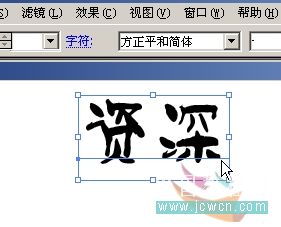7在屏幕上点一下,输入"资深"二字,然后点选择工具(快捷键V),将字体定义为"方正和平简体"。当然也可以用其它字体代替。