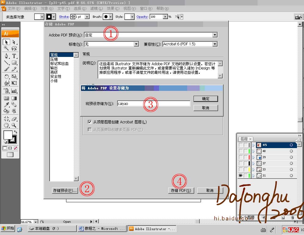 一、打开分层的AI文件,ctrl+shift+s 另存为*.PDF(指定好路径),出现存储adobe PDF对话