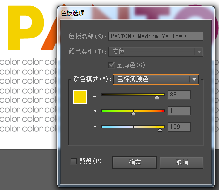 现在我们来查找一下两份文档的不同之处。打开pantone.ai,把鼠标移到色板的位置,双击黄的小色块;或者选中色块后,单击色板右上角的小白三角,选择"色板选项";或者选中色块后,单击
