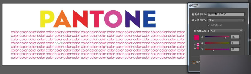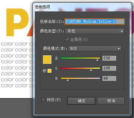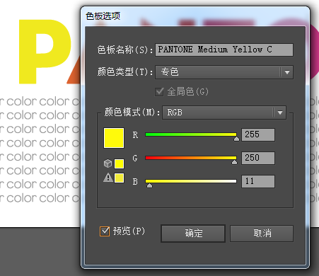 文档pantone.ai的PANTONE色使用色标簿默认的色值显示,现在我们来修改它。把颜色模式换成RGB,数值改为R255,G250,B11,怎么样,颜色是不是变亮了?