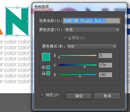 我们打开红色色块的选项,将颜色数值修改为R0,G174,B142。是不是字母N变成了绿色?
