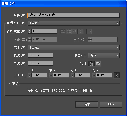1、Ctrl+N新建一个300*300mm的文档。命名为混合模式制作名片。