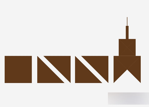 4、矩形工具按住shift键绘制一个正方形。使用删除锚点工具将正方形修剪成一个等边三角形,复制3个,使用旋转工具和镜像工具组成一个正方形。(这里有点像拼七巧板哦)