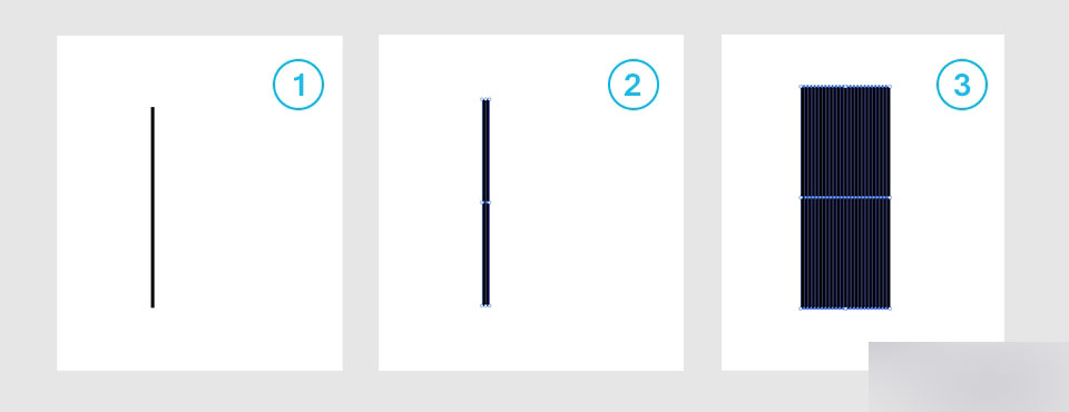采用矩形工具画上第一根线条。线条的粗细由具体的情况来决定。填充黑色,关掉描边。然后,按住ALT键用鼠标拖动第一根线条就会产生出第二根线条,将第二根线条靠近排列到第一根的右边,智能参考线会帮助你自动对齐两根线条。选中第二根线条的基础上,采用快捷键"ctrl+D"就能重复上一步的操作,这样就出现了第三、四、五、……根线条。