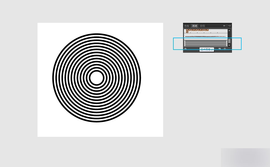 因此,现在我们画一个普通的正圆,将这个圆关掉填充,打开描边。描边大小可设置为1pt。画好后打开画笔工具栏,然后单击一下刚刚制作的艺术画笔,很快这个线性条纹圆就做出来了。