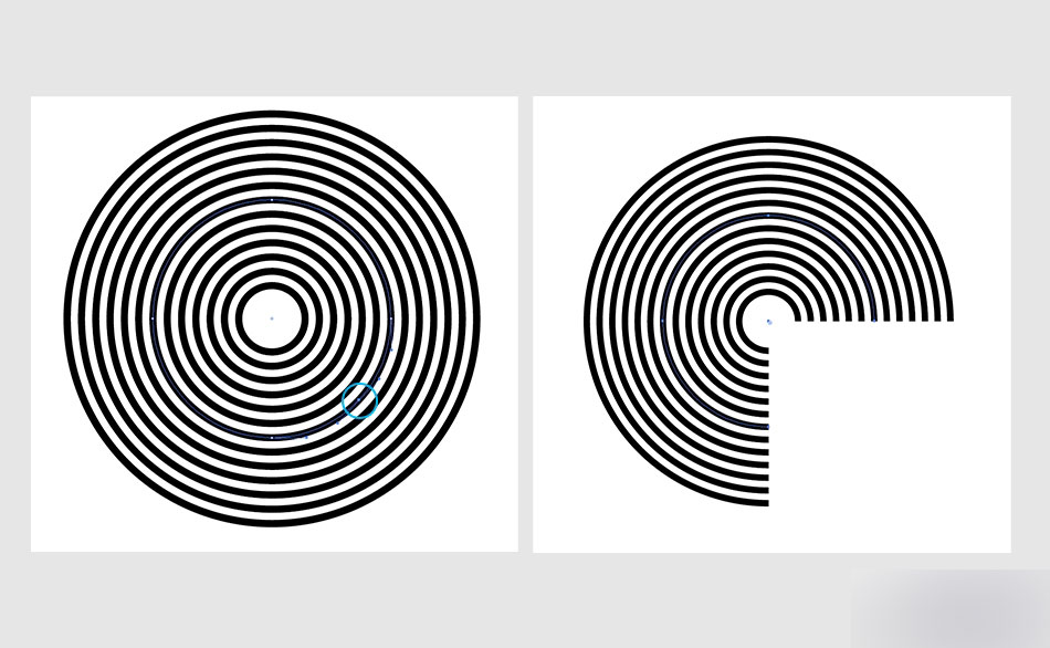 首先做一个半圆。选中刚刚画好的线性条纹正圆,利用钢笔工具在右下方,也就是最右边和最下方的两个锚点的中点处单击一下,增加了一个锚点。然后,再点选直接选择工具,保持刚刚增加的锚点为选中状态,直接单击键盘上的"Delete"键。这时就能将这个圆的这1/4的部分删掉。