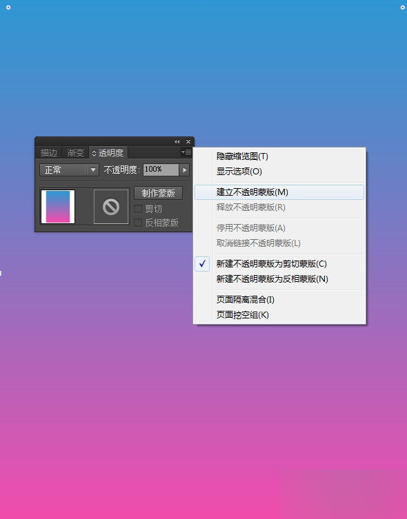 选中做好的图案,采用快捷组合键ctrl+C,进行复制。再回到刚刚的渐变矩形这里,选中矩形,在透明度面板中,点击下拉菜单按钮,在下拉菜单中选择"建立不透明蒙版"。