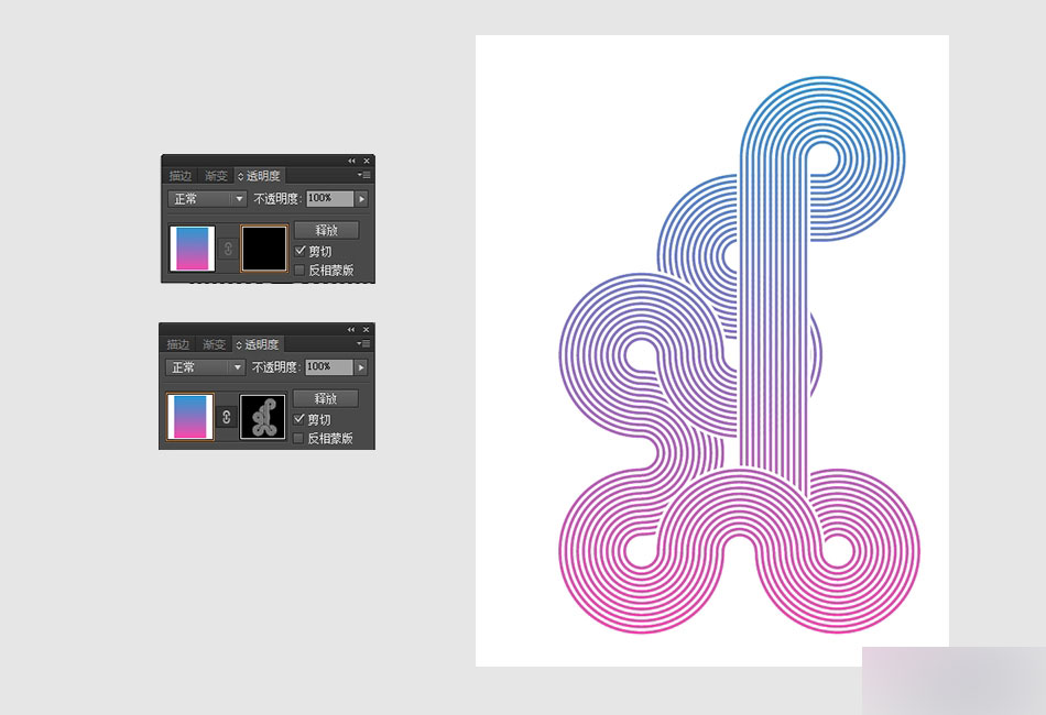 这个过程是利用了黑白颜色对渐变色板的蒙版进行改变的原理进行上色。这种上色的好处就是,随时能改变颜色,删除蒙版就能轻松恢复到刚刚原始的黑白色。鼠标重又单击透明度面板中的渐变矩形缩略图,就从蒙版编辑中恢复正常状态。而这时,我们还可以直接将原先的黑白的条纹图案删除。