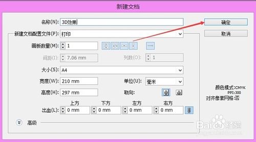 2、在弹出的新建文档对话框里,输入名称3D效果,设置好文档的大小和高宽度,然后点击确定,如下图所示。