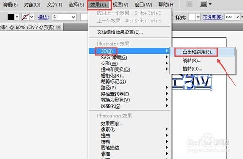 6、下面我们在点击AI菜单栏上的“效果”---->"3D"--->"凸出和斜角"选项,如下图所示。