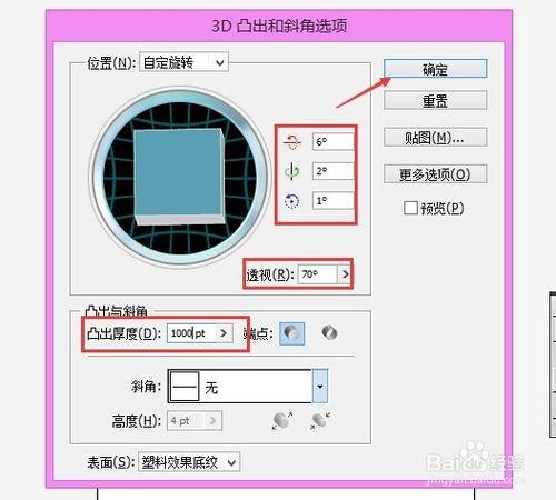 7、在弹出的3D凸出和斜角选项对话框里,我们分别设置X,Y,Z轴,透视角度,凸出与斜角的凸出厚度等,具体参数可以参考我的,也可以根据实际需要的效果进行修改,然后点击确定,如下图所示。
