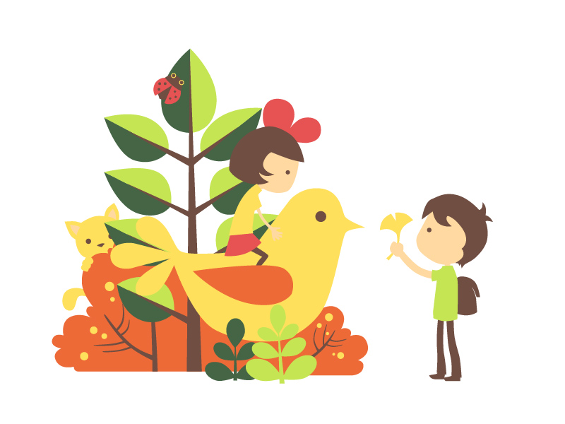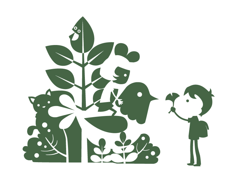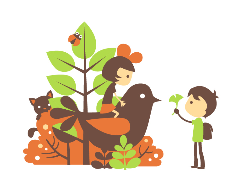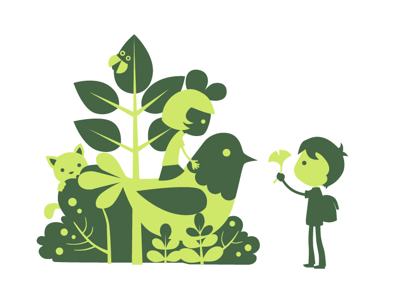 <一>、在上一步的过程中,我就已经感觉到,我们其实一直忽略了一种颜色。对!是白色,也就是白色T恤底衫的颜色!!其实凭借着人类强大的脑补能力,只要利用好白色,浅绿色也是完全可以去掉的!于是加了几片叶子来反衬出女孩衣服和鸟尾的轮廓,得到了只用一种颜色的版本。不过这个版本有些地方处理得比较凌乱,特别是女孩的手、腿和裙子那部分(说到这里抬头看了一下上面<二>的图,发现居然忘了把女孩的腿用深色标出了!于是楼主真是个粗心的孩纸……)