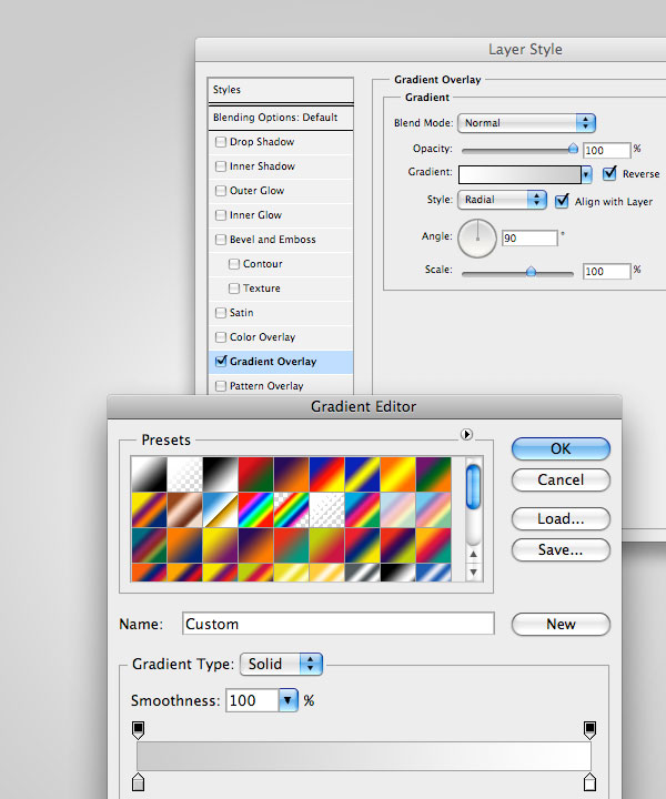 双击背景层,调出图层样式面板,增加从白色 (#ffffff)到灰色(#cccccc)的径向渐变。设置如下