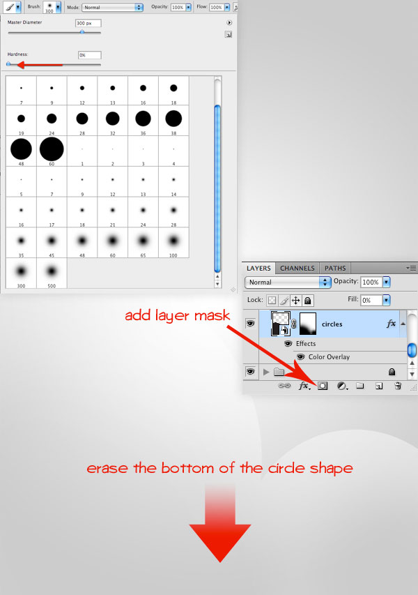 此刻,我们将把这组圆形与背景融合起来,让它们看起来像是很大,且造型独特的云彩。添加图层蒙版然后擦除底部的圆形。为此,把前景色设置成黑色,然后选择硬度为0的笔刷。