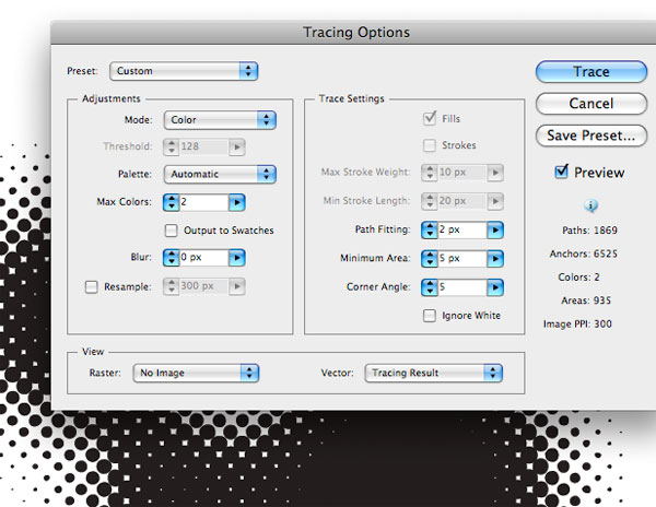 接下来需要将刚刚制作的彩色半调图案转换成矢量图形,对象实时临摹临摹选项,具体数据设置如下。设置好后按临摹按钮