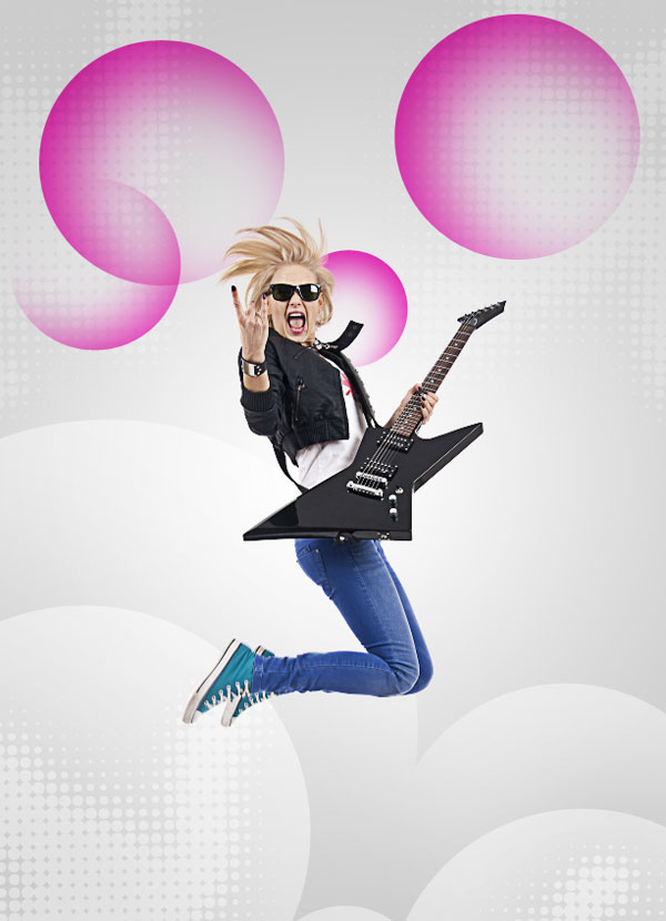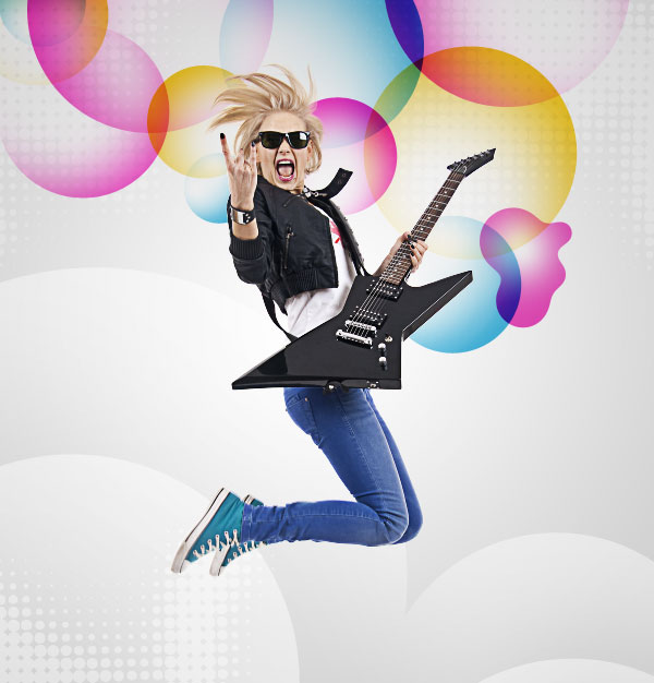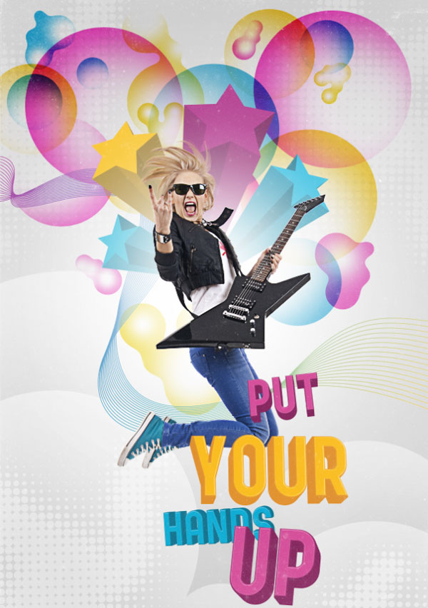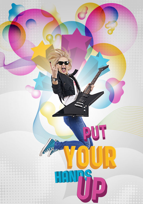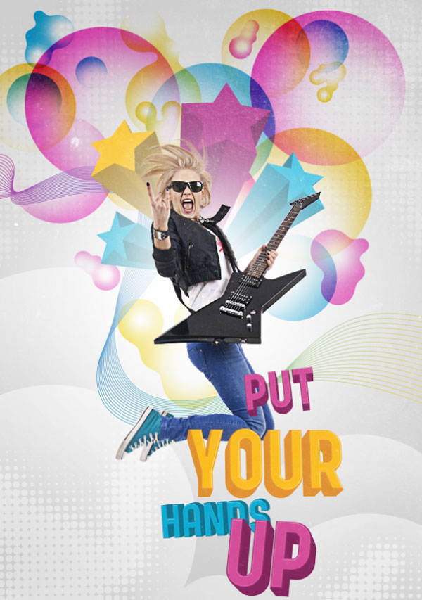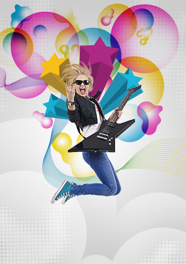 我们要开始绘制一些几何装饰性图形了,在这里,我们不需要illustrator了。新建一个图层组,命名为"colored circles",并放置在吉他弹奏者的下一层。