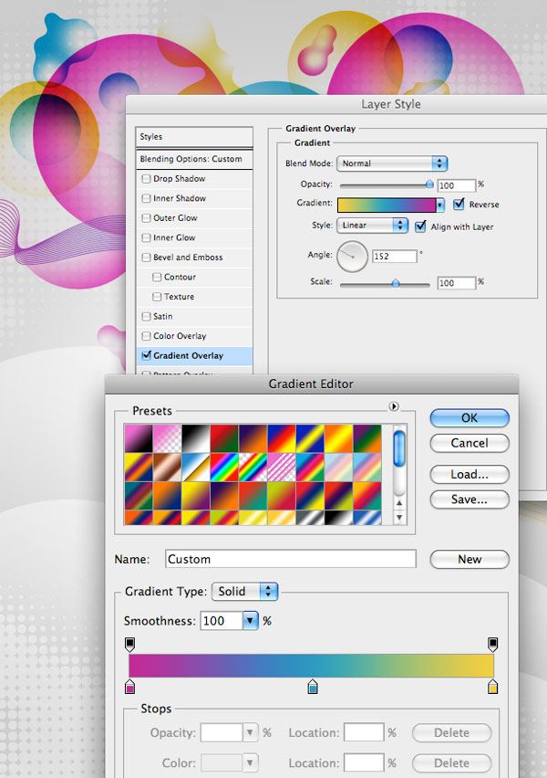 接下来改变带状元素的颜色,调出图层样式面板,用你事先定好的颜色设置渐变叠加。