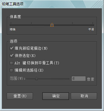首先利用左侧工具栏中的铅笔工具,双击铅笔工具的图标,会弹出铅笔工具选项面板,在面板中进行设置。大家可以参考我的设置。其中保真度的滑块会随着你的调整,在进行描绘时会有不同的保真和平滑偏向。由于手绘的特性,通常画出的线都不够平滑,因此软件在此基础上帮你追加了平滑度,但如果你的画所呈现的特点并不需要平滑,那么就尽量靠近保真。