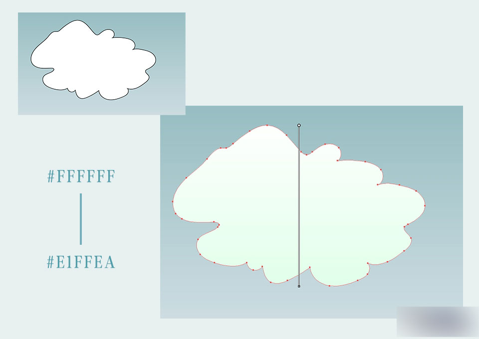 保持白色填充,黑色描边,画上第一片云朵。进入外观面板,将画好的云朵的描边关掉,白色填充改为渐变色填充。渐变色从白色过渡到淡青色,并且将渐变角度改为-90度。